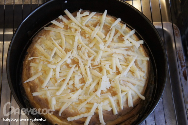 теперь снимаем фольгу и посыпаем сверху сыром, выключаем духовку и осталяем наш торт минут на 5-7 в духовке дойти до нарядного состояния