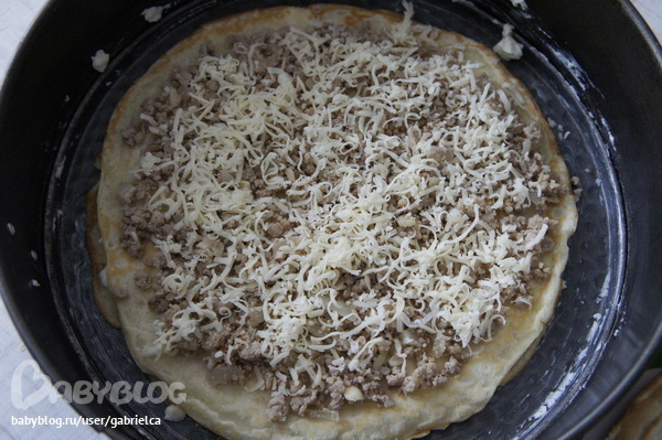 на блин кладем начинку из фарша и посыпаем ее сыром