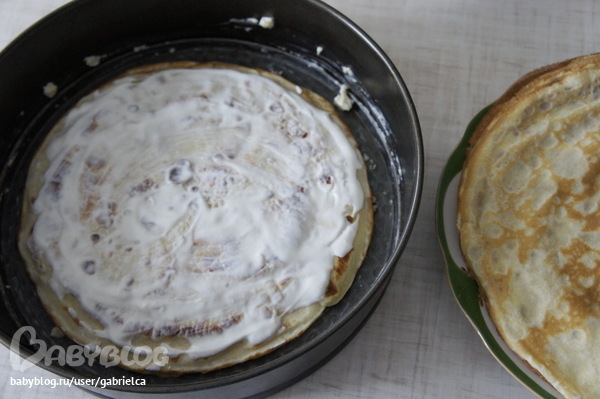 накрываем блином, рукой прижимаем, теперь смазываем сметаной и накрываем все блином
