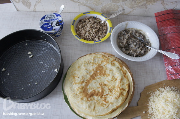 и теперь так и собираем пока что-то не закончится : блин, сметана, блин, начинка, блин, сметана, блин, начинка, блин .......... Сверху у нас оказывается просто блин. Накрываем фольгой и ставим в духовку минут на 20 при 200 гр.