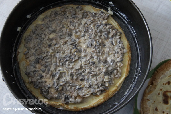 на этот блин кладем начинку из грибов