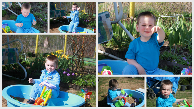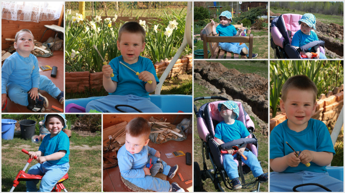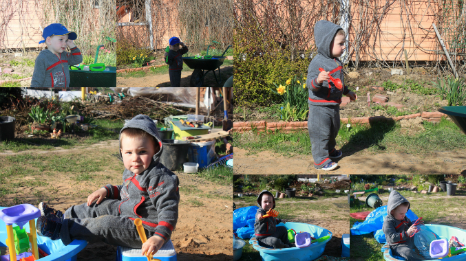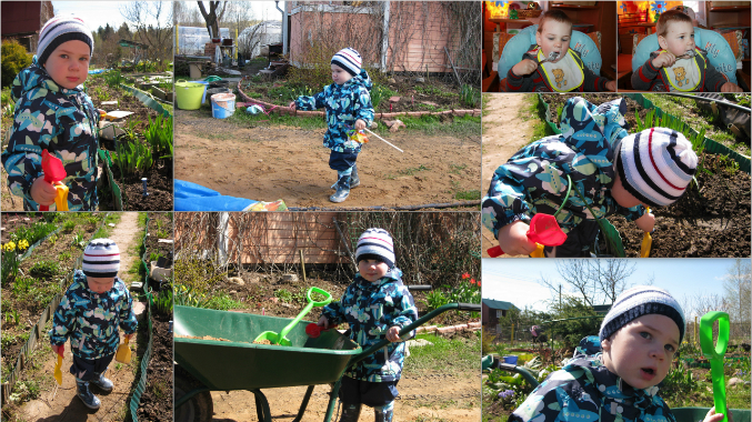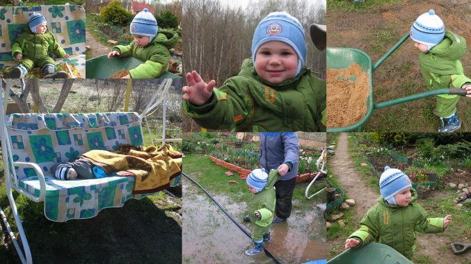 На следующий день прошел дождь, на участке и так еще оставалась вода после таяния снега, а тут еще больше затопило. Как удачно я все же купила резиновые сапоги, очень пригодились! Стали возить тележки с песком, чтоб немного присыпать это болото. Женька активно участвовал: держался за тележку, скидывал своим совком песок из нее и потом притоптывал.