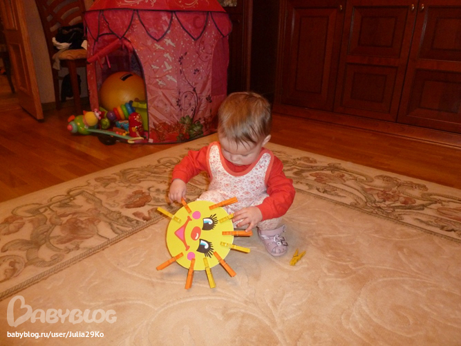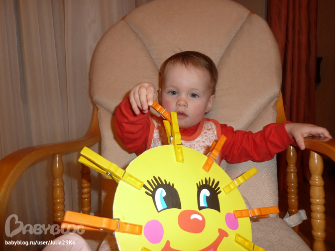 После 30 минут работы с бумагой и клеем, у Верочки появилось вот такое солнышко. Что с ним делать Вера наполовину догадалась сама. "Лучики" снимает хорошо, точнее не снимает, а стаскивает, одевать еще не научились, одевает с моей помощью. Значит игрушку мама соорудила не поздно, еще есть чему учиться: правильно снимать и одевать "лучики", будем развивать моторику =)