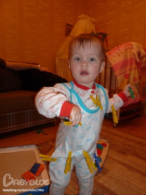 Пока я воплощала в жизнт задумку, Верочка усердно снимала с себя прищепки, которые "добрый папа" прицепил ей везде =) На удивление, от такой забавы деть был в восторге.