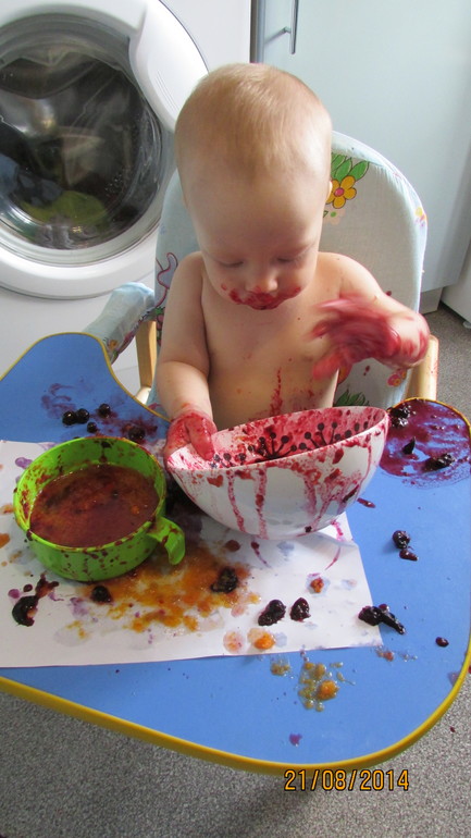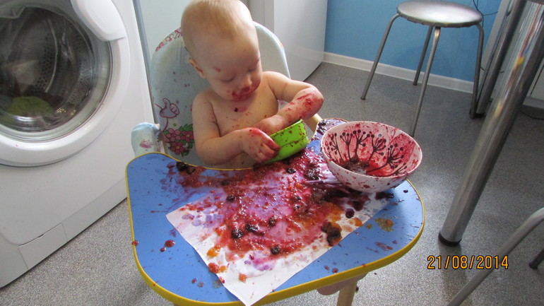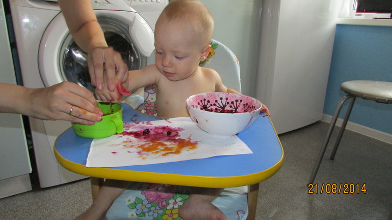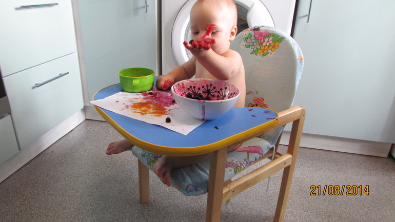 Потом легко все это смылось с него и со стола тоже)) гарнитур и стиралку мыла 5 минут)))...стул.это да..сидушка тканевая у нас..но так как стул отдали нам...и она и так была грязная и собиралась шить новую накидку..не жалко...но если что можно одноразовую впитывающую пеленку..и потом выкинуть сразу)))или же изначально на полу посадить ребенка на две-три пеленки)))Вообщем все прошло классно)))Думаю повторим уже с пальчиковыми красками..лишь бы не начал есть их)))