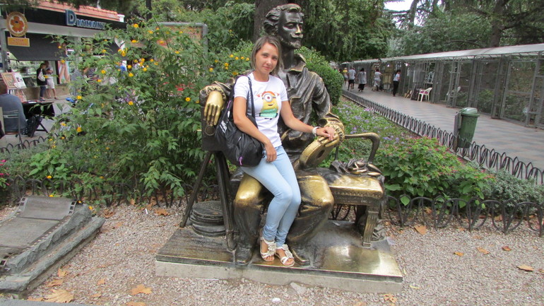 Знаменитая Чеховская дама с собачкой..а я с Чеховым..но еще старушка нетерпеливая..блин..весь кадр испортила.