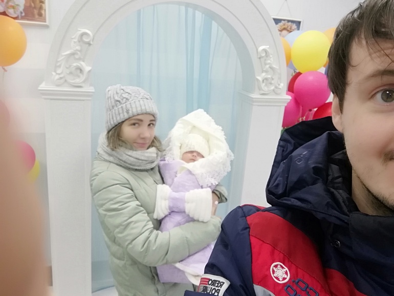 Хорошо, что мы были в перенатальном центре и выписывают из детского отделения тоже через красивый выпиской зал) но фотографа не успели вызвать, очень хотелось домой уже))) Счастливый папа))) хорошо, что только в куртке одетая я)) не видно мои круглых форм🙈🙈🙈