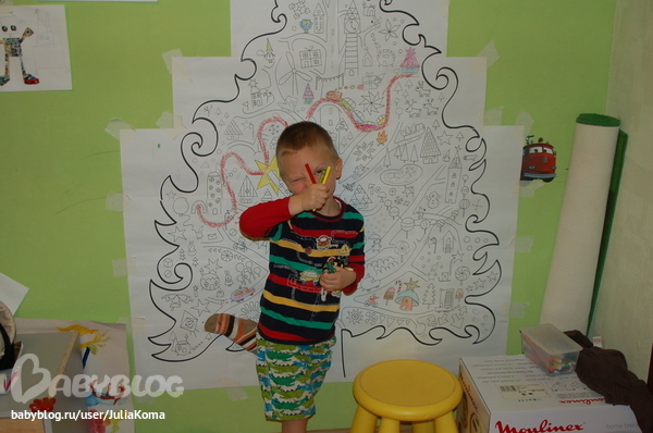 Ну и еще, как мне сказали это тренд- мы распечатали и повесили для раскрашивания гигантскую елку.