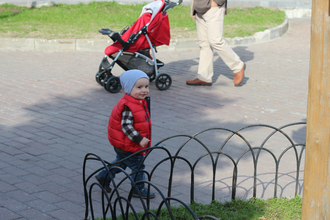 с хитрыми глазами убегает от мамы!