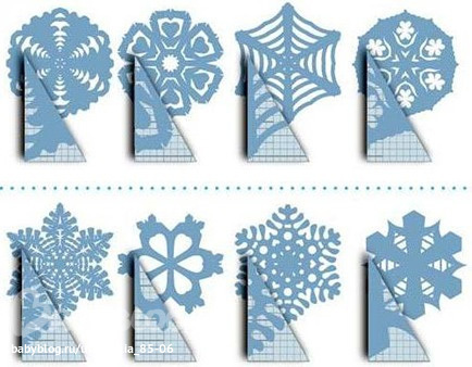 Берём или уже готовые снежинки, которые ребёнок вырезал в садике или школе, или вырезаем новые. Схемы красивых снежинок вы можете скопировать с этой картинки:
