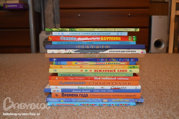 в основном это стихи. проза ребенку неинтересна. только если есть большая картинка, а текста мало, иногда получается почитать)) ниже покажу обложки и дам ссылки на книги в Лабиринте, т.к. там чаще всего есть фото разворотов и хорошие рецензии на книги