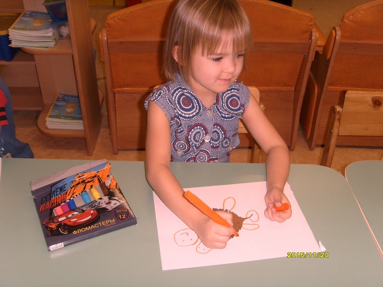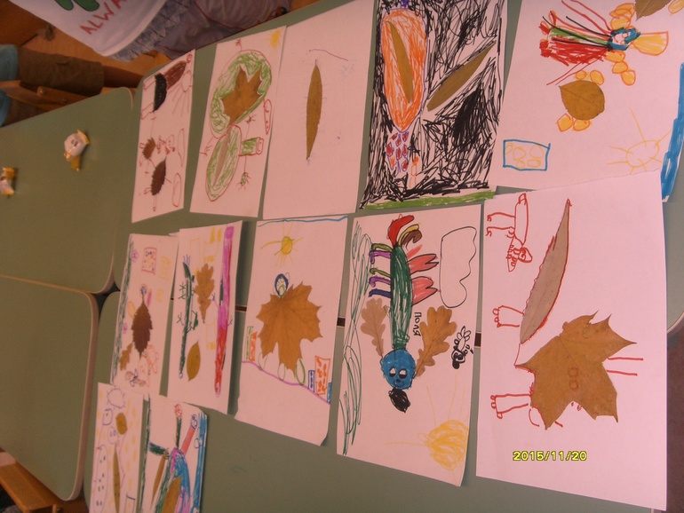 Дети получают листы бумаги, на которые наклеены осенние листья и фломастеры. Ведущий: "Волшебные лесозаврики уже начали проявляться на ваших листах. Может быть это появилась голова или туловище или ноги. Я не знаю! Но вы возьмите фломастеры и помогите им появиться полностью, дорисуйте лесозавриков" Потом мы им еще имена придумывали и истории про них сочинили