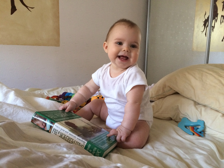 Сидит как стручок, уверенно и садиться везде и всегда. На ножки пытается вставать, подтягивается, подтягмввается и не получается. Но она не сдается.
