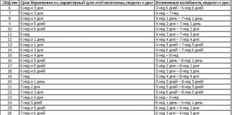 Таблица 1. Зависимость срока беременности от среднего внутреннего диаметра плодного яйца (