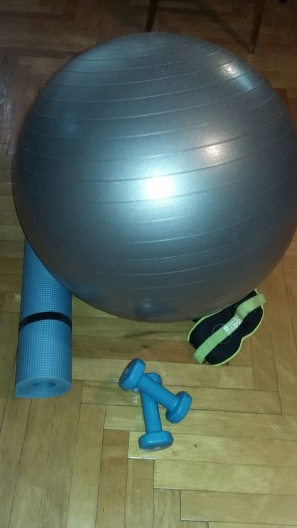 Вчера съездили в Декатлон, потратила две тысячи рублей на, так сказать, свои запросы, дай бог не бесполезные. Купила фитбол, две гантельки по 1,5кг, два утяжелителя на ноги по 0,75кг и коврик. На прошлой неделе начала заниматься по чуть-чуть сама дома, но поняла, что без этих прибамбасов мне как-то неинтересно. Хочется чувствовать себя в спортзале. Инвентарь таки необходим.