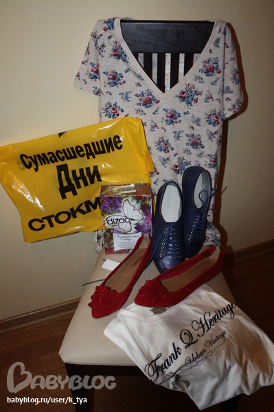 В итоге не купила практически ничего. А дома насчитала 5 пакетов. Гы. Вот, разобрала содержимое (коробочка для подруги, белая футболочка снизу для мужа, остальное моееее):