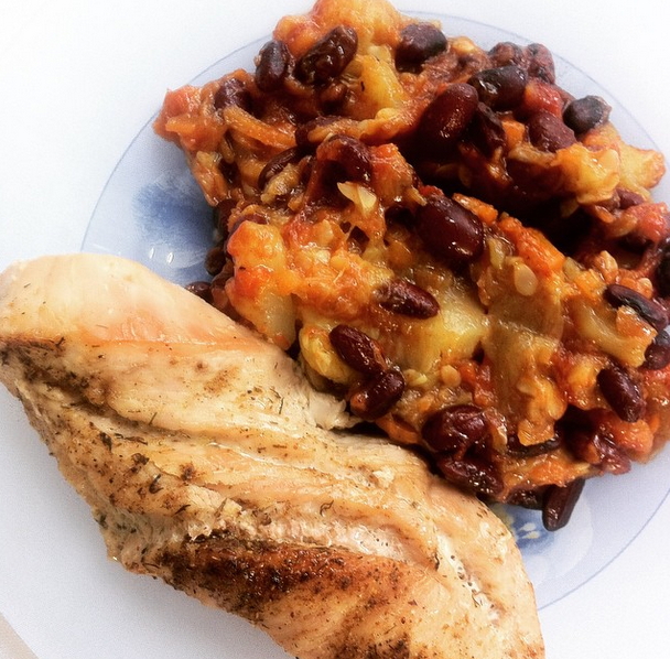 ПыСы. Гарнир из отварной фасоли и тушенных кабачков с морковью.