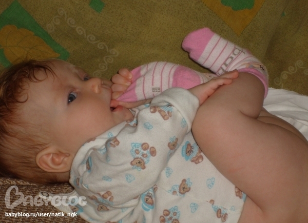 мы ножки уже давно нашли, но подтягивать раньше было сложно, а сегодня да, было дело, ногу прям в носке в рот пихнула