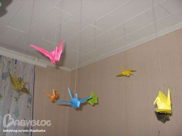 Это журавлики счастья.Говорят,если сложить 1000 таких журавликов-твое желание сбудется. Под потолком их 12.Не знаю,почему столько "родилось",правда 12 июня,12 год...Да и вообще магическое какое-то число.