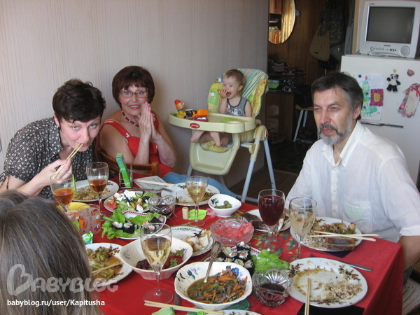 На столе у нас роллы 3 видов+роллы сладкие из шоколадных блинчиков 2 видов( внутри малиновый джем+груша и клубника+мягкий шоколад),салат "Сердце самурая" из сердца,огурца,моркови и заправки с чесноком и кинзой,также "роллы" из лаваша с корейской морковью и сыром,фрукты,мною маринованый имбирь.На горячее смесь 4 риса и Кунг пао из курицы(обалденный рецепт!)
