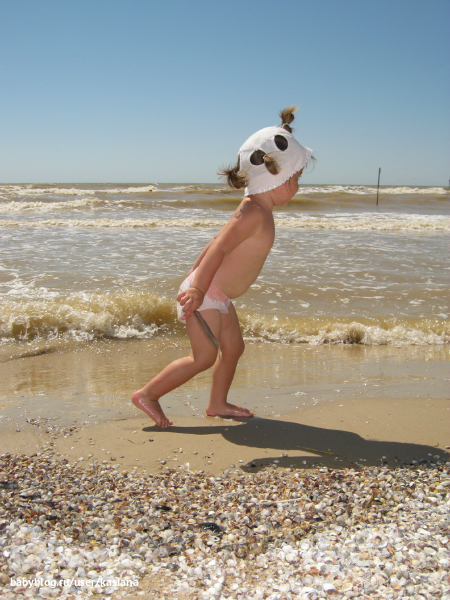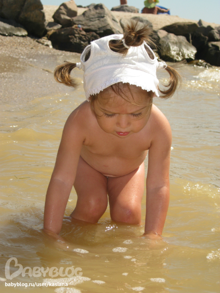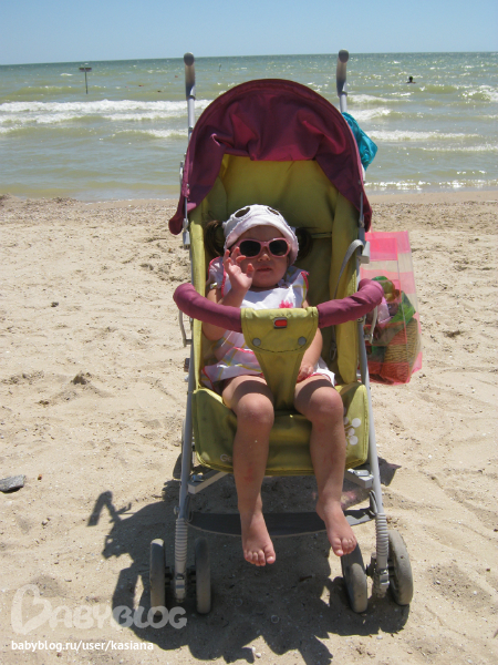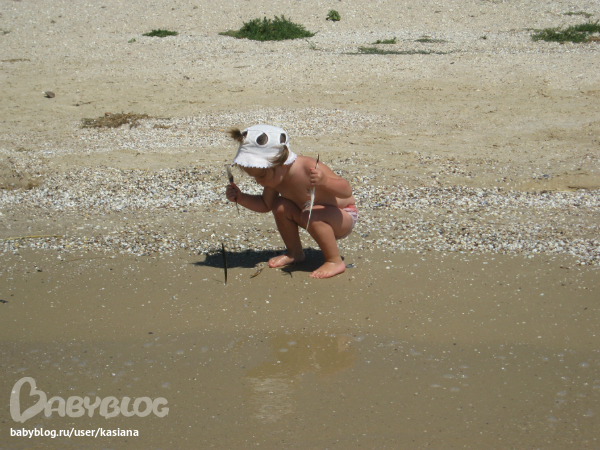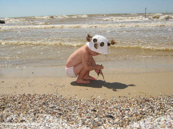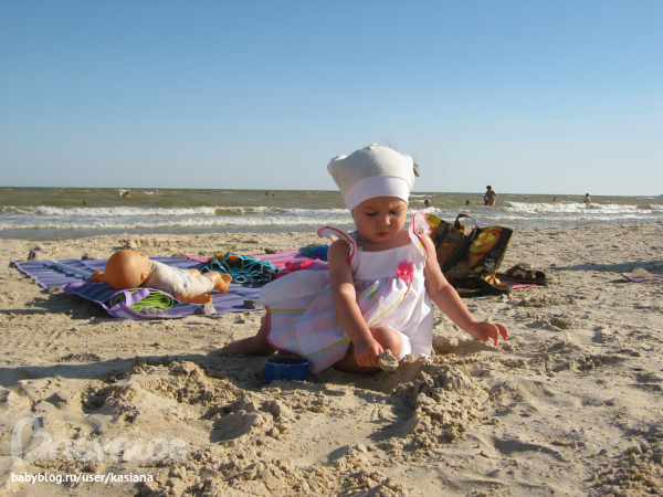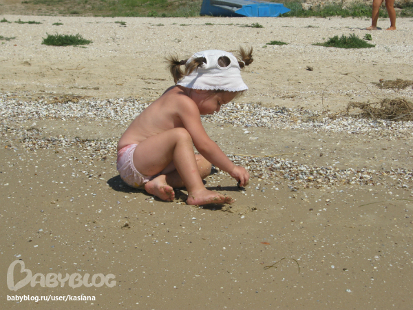 А на море нам было очень весело, хоть и без папы (он работает) - Мелана воды не боится совсем, больших волн тоже. Бегает по пляжу, строит замки, украшает их ракушками и перышками, рассматривает с любопытстовом маленьких голеньких мальчиков... да и вообще всех детей, особенно если они заняты чем-то интересным. Может взять ребенка за руку и потащить его куда-то. Может, правда, подойти и разгромить чей-то замок или забрать понравившуюся ракушку, но мы над воспитанием работаем ). Все коврики и все игрушки на пляже тоже почему-то считает своими (ну типа большая песочница), не раз было такое, что подходила и ложилась на чужую подстилку ). Если кто-то из детей чего-то не дает, то Мелана делает ангельское такое личико, наклоняет голову вправо и поет "паааааааа" (это означает пожалуйста), но откуда всем детям об этом знать?!