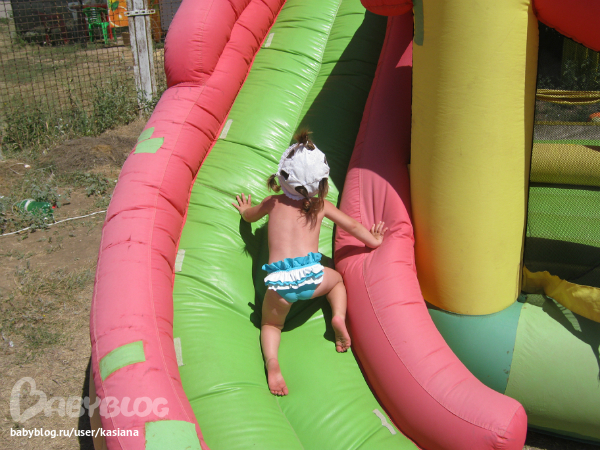 Полюбила батуты на пляже, просится как только так и сразу, кричит "батю", но я уже стараюсь туда не водить, так как остаток дня Мелана будет как ужаленная в одно место. Но Мелана пытается это дело себе как-то замещать, и ей всюду мерещатся горки - и на горочке из песка, и на перевернутой лодке...
