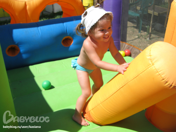Очень любит плавать. Да-да, именно плавать, так как гребет и руками, и ногами, а мои руки, которые ее поддерживают, пытается от себя отодрать, ибо чересчур самостоятельная и считает, что может справиться и сама... в круге тоже любит плавать и на черепахе. Без надувного чего-нибудь на пляж не пойдет, и совершенно глупо ей объяснять, что сегодня в море большие волны. Очень любит мои парео, постоянно пялит их на себя.