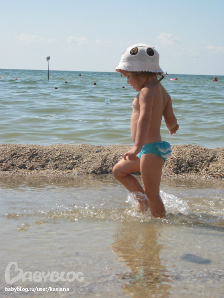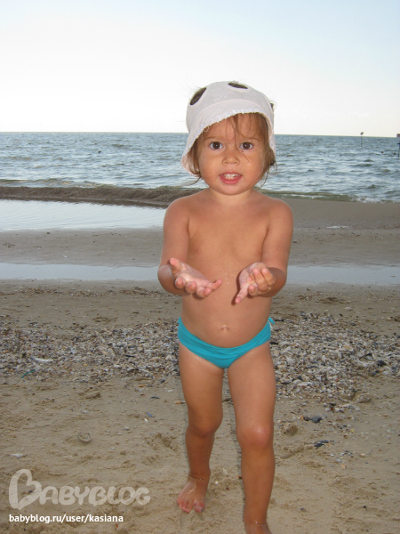 За две недели отдыха у Меланы появилось много новых слов. Самое неожиданное - САМА, говорит его постоянно, даже если сама не умеет! прямо терроризирует меня этим словом! обуваться - сама! раздеваться - сама! есть - сама! (хотя все падает и разливается...) деньги в магазине давать - сама! рисовать - сама! плавать - сама! Плавает, кстати, действительно сама. Одевает нарукавники (сама, конечно, же, а потом просит надуть), одевает круг, идет в море, заходит на глубину и начинает плыть! сама гребет ножками и разворачивается в нужную ей сторону. Категорически не разрешает во время плавания прикасаться к кругу, а уж тем более к ней! Орет "сама" на всю округу! Мимо проплывающие люди постоянно спрашивают, сколько девочке и очень удивляются, что только год и восемь ). Мне вот интересно, вспомнит ли она эти навыки в следующем году. Любит плавать только в штиль, волны совсем не любит и ругает их "ну-ну-ну".