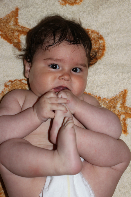 За один день до 5 мес стал все-таки не только разглядывать ножки, но и грызть )