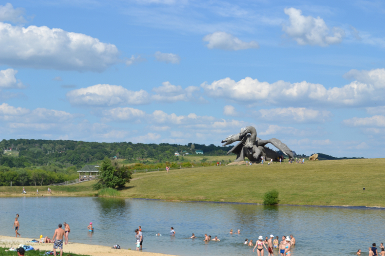 Было очень жарко и дети купались в пруду, вода чистая, пляж песочный, вполне приятный.