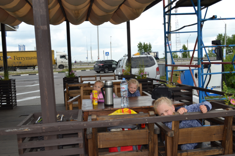Остановились на обед на заправке Газпром нефть. Нам даже разогрели нашу еду в микроволновке.