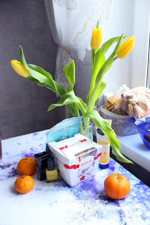 А 8го на работе удивили тюльпанами и желтым набором косметики, я как фанат желтоговсего млею до сих пор, цветут и пахнут до сих пор ага :)