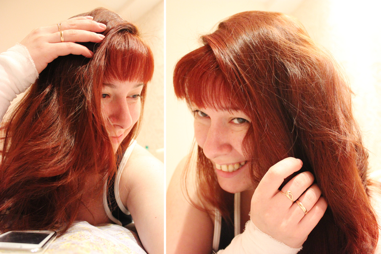 1. Купила как-то спонтанно сегодня себе наконец краску для волос, два месяца как никак собираюсь ага :) Итог - покрасилась, в зеркало девкиной комнате волосы выглядели красными, а не рыжими как задумывалось, решила посмотреть на себя в своей комнате, была спалена мужем за себялюбованием, гнобёж шёл еще часа два) но в итоге по-моему я таки рыжая, да?! ;))) всё лучше чем типа амбре облезлое мое на голове)
