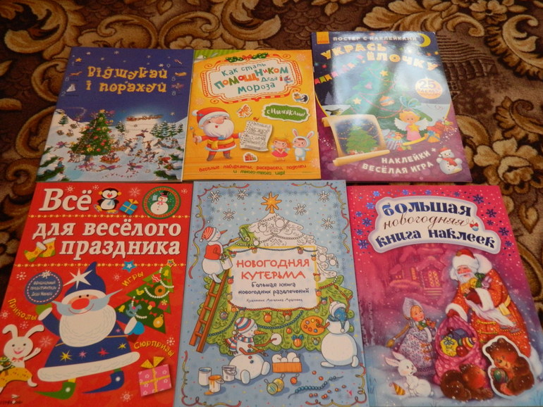 "Большая новогодняя книга наклеек". Тоже толстенькая книжечка с заданиями, интересной информацией и наклейками.