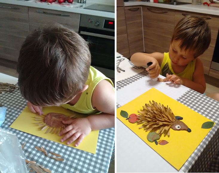 Идея с поделкой сына пришла, неожиданно, когда стали собирать природный материал и сын принес "вертолетики"... тогда решили сделать из них ежика.
