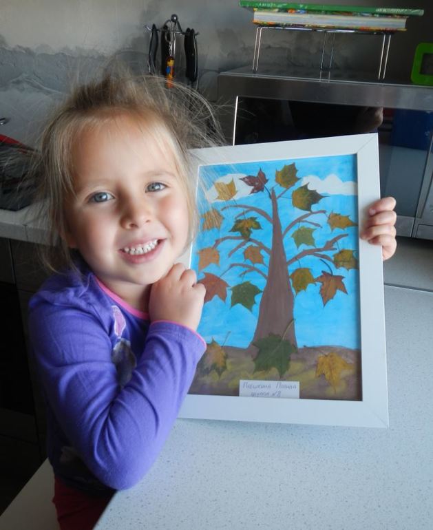 Долго думала, что делать, а потом решила сильно не выдумывать, т.к. младший не очень то дает творить... да и хотелось, чтобы поделка была максимально сделано дочерью. В итоге вот, что у нас получилось, дочь все делала сама, только листочки я ей помогла распределить по картинке.