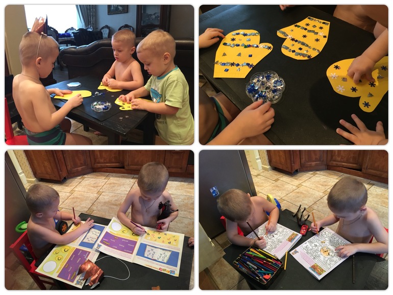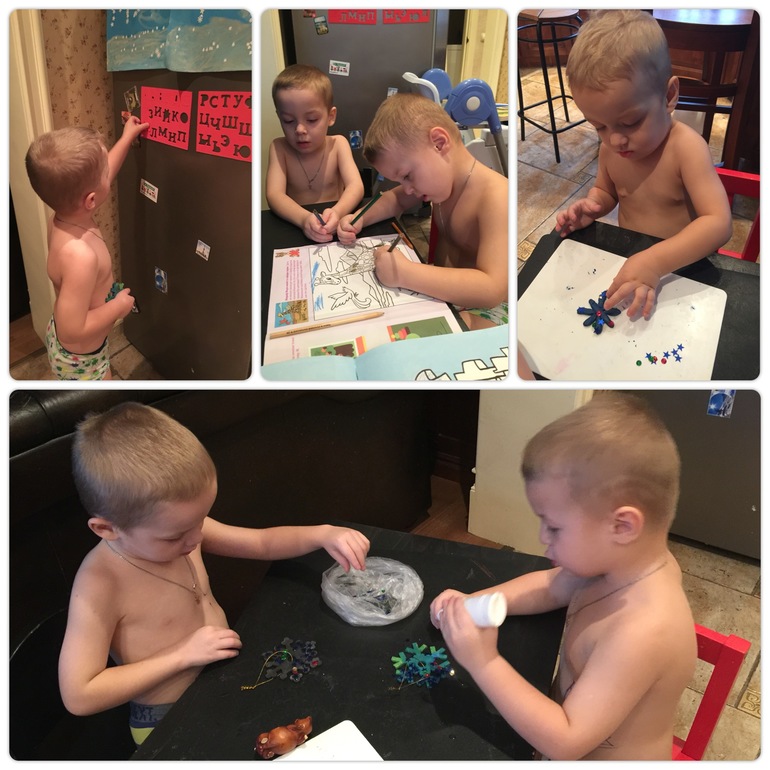 8. Ж - похоЖа на снеЖинку) поэтому сегодня делали снежинки: Артем сделал из пластилина (полностью сам, ребята только немного помогли ему сформировать снежинку на доске) и украсил её блестками, а двойняшки украшали пайетками деревянные снежинки, которые они сами же раскрашивали в позапрошлом году красками:
