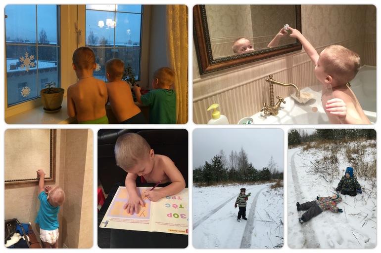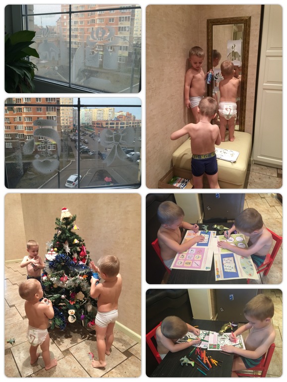 10. Сегодня было сразу две буквы: И и Й. Первым словом, пришедшим в голову, было "ИнеЙ", также вспомнили "изморозь", "иллюминация" и "игрушки". ДМ подарил нам сегодня искусственный снег, которым мы украсили окна в детских комнатах, зеркало в гардеробной и елку:
