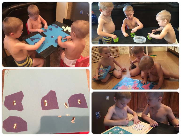 12. Л - лёд, льдина, Северный Ледовитый океан, ледокол, ледоход, Лапландия, ледниковый период, лыжи. Заморозили ледяные украшения для уличных ёлок; как похолодает, пойдём украшать двор. Посмотрели океан и лапландию в нашем атласе и по-быстрому сделали поделку по его мотивам: пингвины ныряют с льдин в ледовитом океане за рыбой))) льдины вырезали сами из самоклеящегося бархата, пингвины и рыбки - фетровые наклейки, оставшиеся с прошлого года.