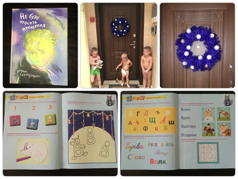 3. Слова, которые мы вспомнили на букву "в" сегодня: ветер, вьюга, вихрь, венок, варежки, валенки, веселье, вытынанки, Великий Устюг. Дети просили вырезать вытынанки (в прошлом году им очень понравились наши окна), но мы ограничились тем, что сделали и повесили венок на входную дверь. А Дед Мороз принёс сегодня в подарок книгу "Не буду просить прощения". Я очень рада, что книги воспринимаются моими детьми как желанный подарок, не хуже игрушек))