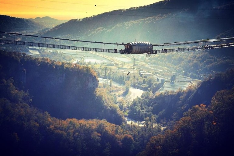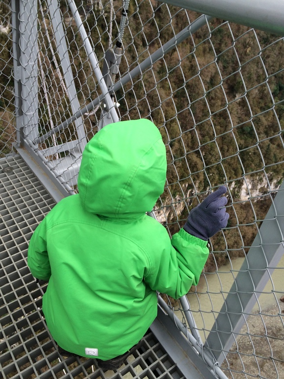 Моих таких колоритных фото нет, ибо чувство животного страха не отпускало меня с момента первого шага на всю это конструкцию и до возвращения на твердую землю. Детей хотелось примотать скотчем, веревками и еще клеем к себе приклеить. Несмотря на то, что там все безопасно- насколько можно употребить это слово глядя в бездну, лезли мои мелкие обезьянки во все дыры и щели. Вот тут-то и понимаешь- нет еще у детей этого страха. Им пофиг, со стула ты вниз смотришь, или с подвесного моста над ущельем на высоте 207 метров. В общем, адреналина выделяется небывалое количество.