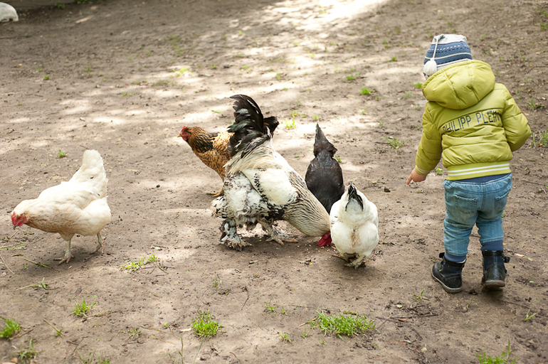 Огороженная территория, где бегают курочки и кролки, также в клетках еще кое-кто сидит.