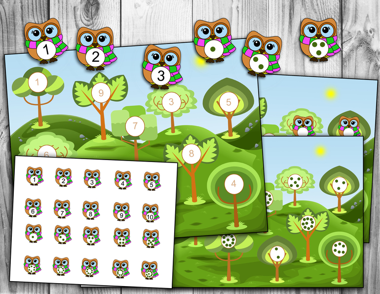 Рада поделиться с вами новой математической игрой для деток,которые только учатся считать и распознавать цифры! Проста в исполнении - совушек нужно рассадить на их дерево,если на пузике цифра - дерево с цифрой,если точечки-на дерево с таким же количеством точек. Уверена,вашему малышу это понравится!