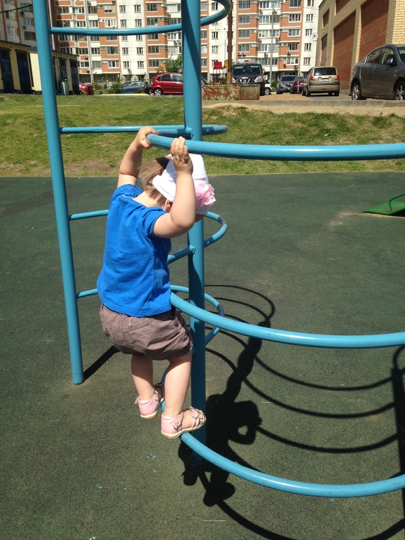 Очень любит Василиса всевозможные лазенки на детской площадки. И что они совсем ей не по возрасту, Василису это не смущает. А я только успеваю с верхней перекладины её снимать.