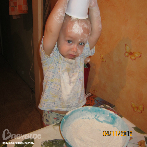 Тут я решила с детьми соленым тестом полепить... Дим активно включился в процесс еще на стадии замешивания теста :) Усыпать себя и все вокруг мукой ему понравилось гораздо больше катания колбасок из теста