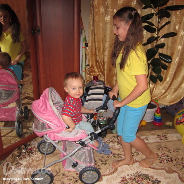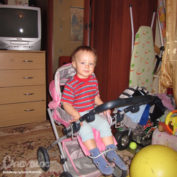 Кукол из коляски выкинул прочь (и не вздумай говорить, что им там место). Сам упорно пытался влезть, чуть не навернулся пару раз, а потом по-барски восседал - "катайте меня, катайте!"
