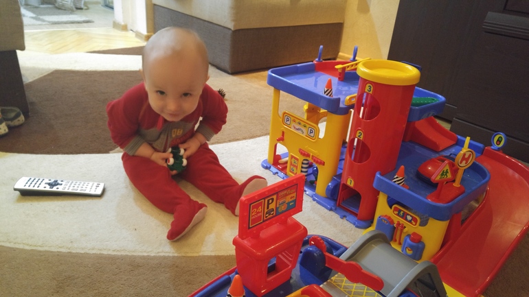 Потом. Любит играть в машинки в гараж, кормить игрушки, читать ему уже можно- стал любить курочку рябу и репку, прсвда обьемные книги все порвал- репку естественн. Вытянул как положенно. Героев репки тоже всех долой из книги...
