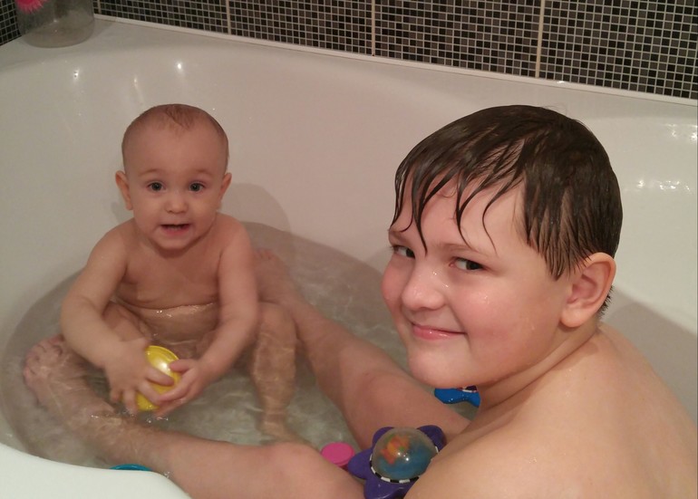 Братская любовь растет и крепнет, с утра просыпается с именем брата БВАДЯ , типа дома ли он? Успеет с ним поиграть? А когда Владя приходит со школы- визжит от восторга и начинает зазывать баловатся)))), купаю их вместе, даже могу не надолго выйти из ванной, Влвдик следит хорошо!