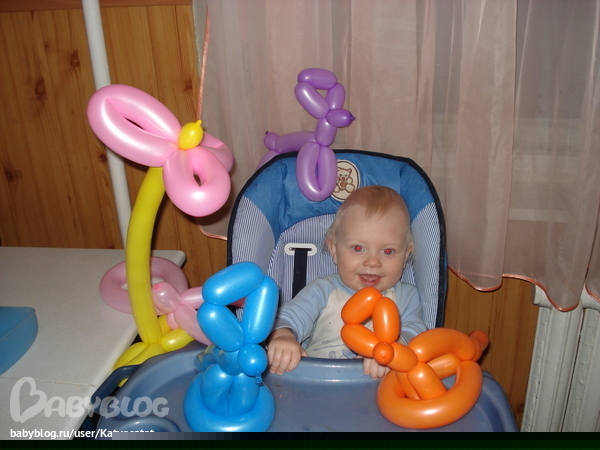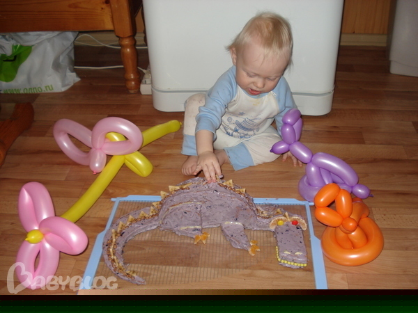Отала ему торт на растерзание, Алёха радостный любимые бананы хватает, аж подпрыгивает. Решила видео сделать, а шарик цветочком возьми и лопни. Алёшка напугался и как ломанётся ко мне через торт)))) Короче потом принимали душ.