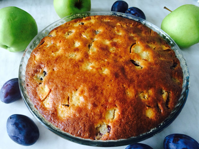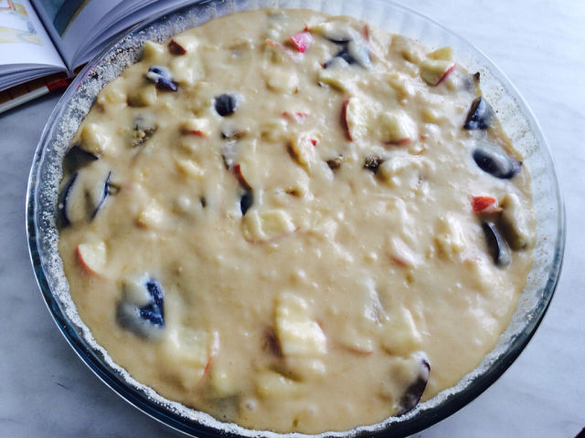 Мы добавили еще сливы с яблоками. Выкладываем тесто в подготовленную форму